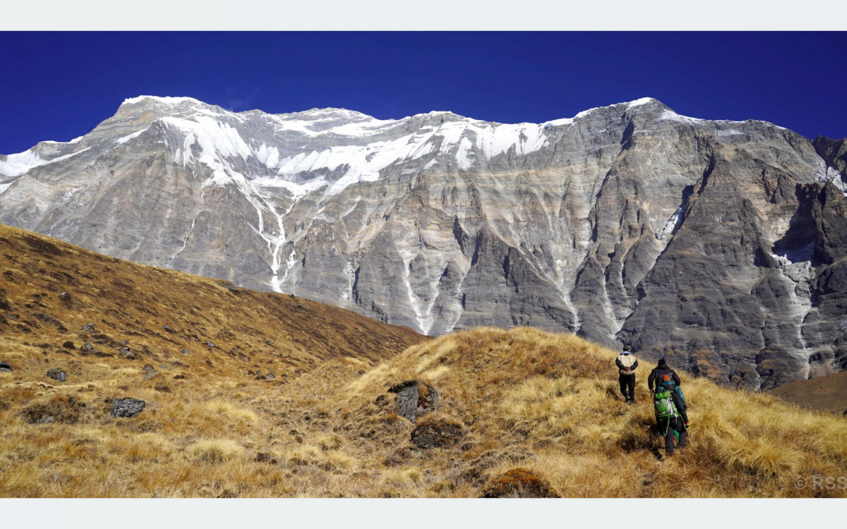 म्याग्दीको रघुगङ्गा गाउँपालिका७ चिमखोलाको भूगोलमा पर्ने धौलागिरि हिमालको आधार शिविर वरपरको दृश्य । समुद्री सतहदेखि चार हजार ५० मिटर उचाईमा रहेको धौलागिरि आधार शिविर पर्यटक र पूर्वाधारको पर्खाइमा छ ।
